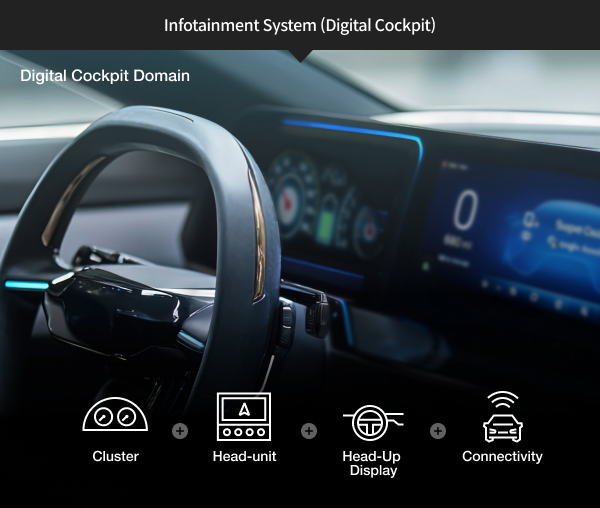 1) Display 扩展 高分辨率多屏显示 - 支持 8K 分辨率,最多 8 屏 | 2) 通信连接 网络连接 & 车辆运行信息 - V2X、emergency Call、Wi-Fi、BT |
