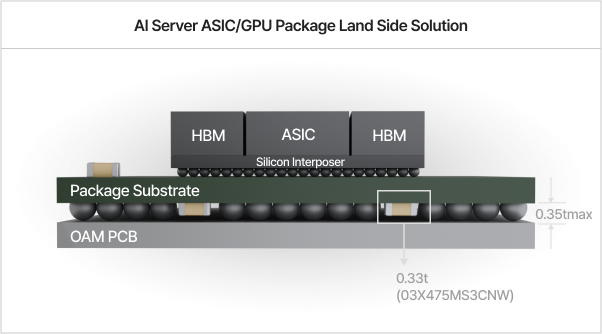 ▷ AI servers require more than 10 times the number of MLCCs in comparison to standard servers. However, the mounting area for MLCCs remains limited, since they must be placed in close proximity to the GPUs. In order to solve this issue, ultra–high-capacitance, small-footprint MLCCs can be equipped into the semiconductor package substrate, placing them close to the silicon dies. This would lead to shortened line paths, optimized PCB designs, and an enhanced thermal management. Their slim profile of 0.33 t also enables them to be used on the land side.