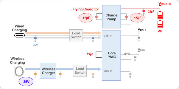 As smartphone charging systems evolve from low-voltage, high-current designs to high-voltage, low-current configurations (or high-voltage charge pumps), 35 V-class MLCCs are expected to become the standard specification for both flagship and mid- to low-end models.2. Super Fast Charging and Flying Capacitors